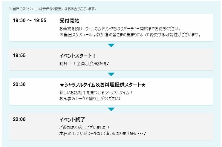 なぜなら、当日のパーティを運営するスタッフ(街コンジャパン社員が大勢)がパーティの進行をきちんと行い、一人でぽつんとなる人がいないように配慮してくれるからです。