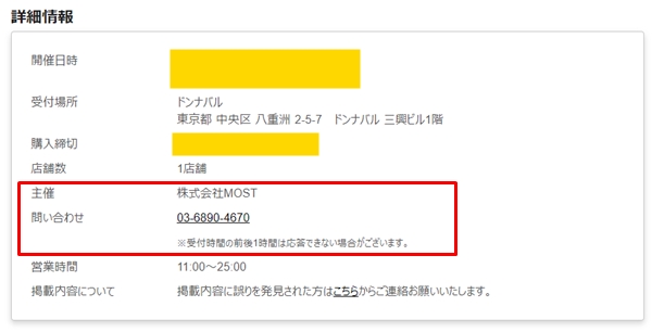 その場合は、イベントページ下部にある主催者の連絡先へ電話をかけてみましょう。