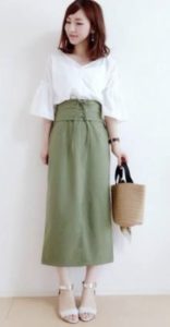 - ボトムスは淡いグリーンのミドル丈のスカート